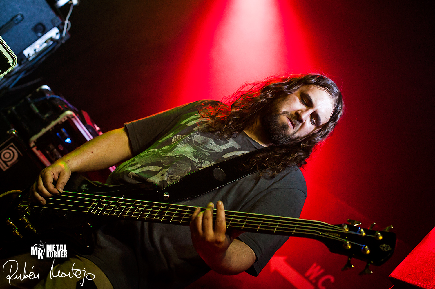 Su puesta en escena es sobria y sobradamente profesional. Con un backline espectacular y con numerosas «GoPros» situadas en muchos ángulos del escenario, mostraron su buen hacer sobre las tablas, con una técnica y actitud envidiables. Por un lado, el alma y cerebro de la banda, es el frontman Bryan, que hace las labores de vocalista y guitarrista principal. Su registro a las voces es espectacular, variando desde falsetes puramente heavys hasta guturales profundos y salvajes. Además, su labor en la guitarra de 7 cuerdas es increible, sucediendo riffs tras riffs demoledores y compaginando con solos melódicos y pasajes ambientales. Un trabajo enorme. Tras 26 horas de viaje por carretera, lo dieron todo en su show, y el resultado fue espectacular.Por otro lado, tenemos a Marcin al bajo y a Paul a la batería, que conforman un dueto rítmico aplastante y perfectamente sincronizado y entrenado. Pese a que Marcin tuvo un pequeño problemilla técnico (se le rompió la bandolera) lo arregló perfectamente tocando el resto del tema de rodillas. Paul a los parches es un gran baterista, con una enorme pegada y técnica. El sonido de la batería fue épico, y es que todos los instrumentos estaban muy bien ecualizados y sonaron a la perfección, pudiendo disfrutar de cada matiz y detalle de sus composiciones.