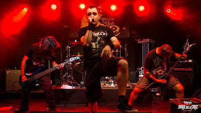 Los primeros en dar el pistoletazo de salida eran los thrashers locales, de Córdoba, con media hora de retraso, lo normal, esperando a que la gente acudiera al bolo (lástima que no fue así). Ante una sala medio vacía, sonaron los primeros compases de lo que se preveía, thrash clásico, con toques de KREATOR en su haber. Tras una introducción musical con unos ritmos incesantes de guitarras, nos dejaban entreveer algún que otro sólo. El segundo tema, “Maniac”, ya nos metía de lleno en el ajo, con unas guturales rasgadas puramente thrasheras que eran matizadas por un doble bombo, el cual daba consistencia al tema. “Slaughter”, fue un tema más pesado, con ritmos machacones, intentando animar a un público muy frio, aunque la actitud del grupo no decayó. Este tema tiene una parte final brutal, siendo uno de los temas destacados de su actuación.