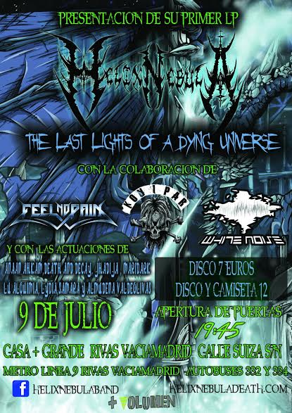 HELIX NEBULA presentará The Last Lights of a Dying Universe en directo, acompañados por KON 1 PAR, FEEL NO PAIN y WHITE NOISE el propio 9 de julio en la Casa + Grande de Rivas Vaciamadrid. El concierto comenzará a las 8 de la tarde y habrá a disposición del público varias ofertas para adquirir la entrada con una copia del disco y merchandising de la banda.