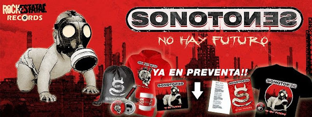 No Hay Futuro será el trabajo más agresivo, rockero y concienzudo de Sonotones. Desde hoy y hasta el jueves 25 de agosto se podrán reservar los packs de preventa del álbum a precio especial. Están a la venta exclusiva en la tienda online de Rock Estatal Records y van desde el CD firmado + chapa por 11,95 € hasta un pack especial con diez productos -entre ellos, material que sólo se podrá conseguir con esta preventa- por 49,95 €. Además a los 100 primeros compradores se les regalará el CD de ‘Los Culpables De Todo’.