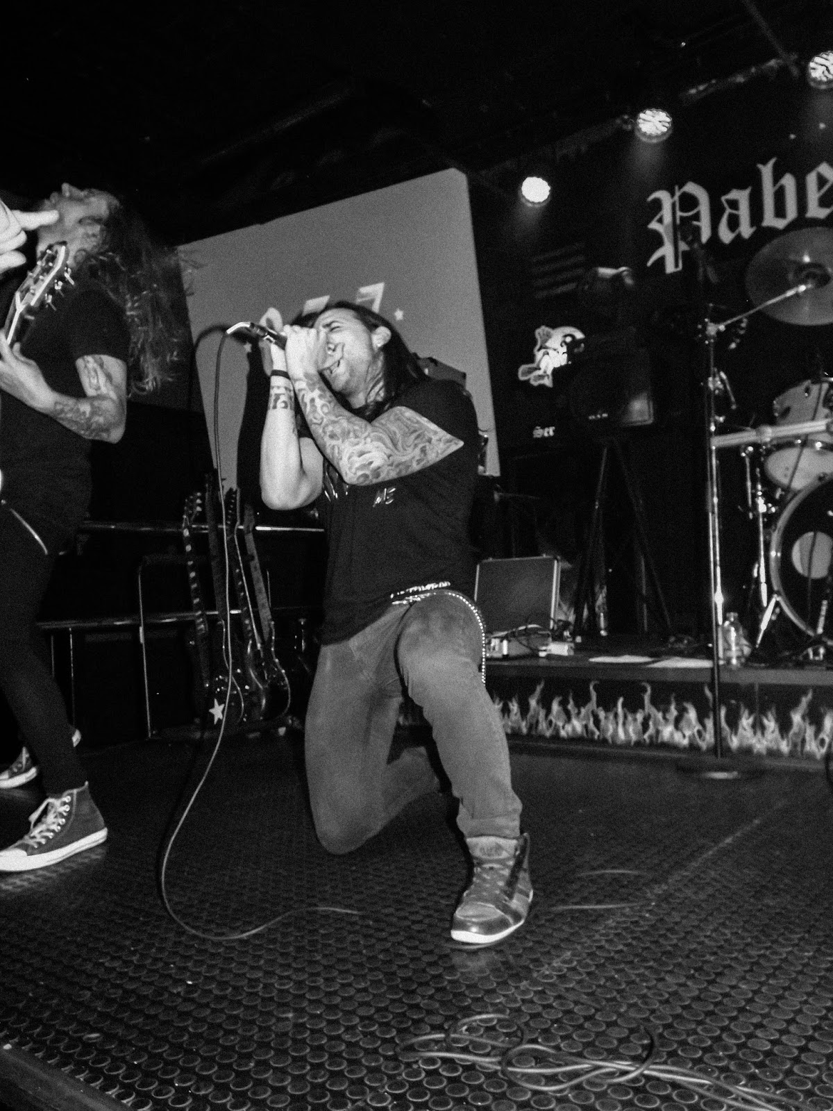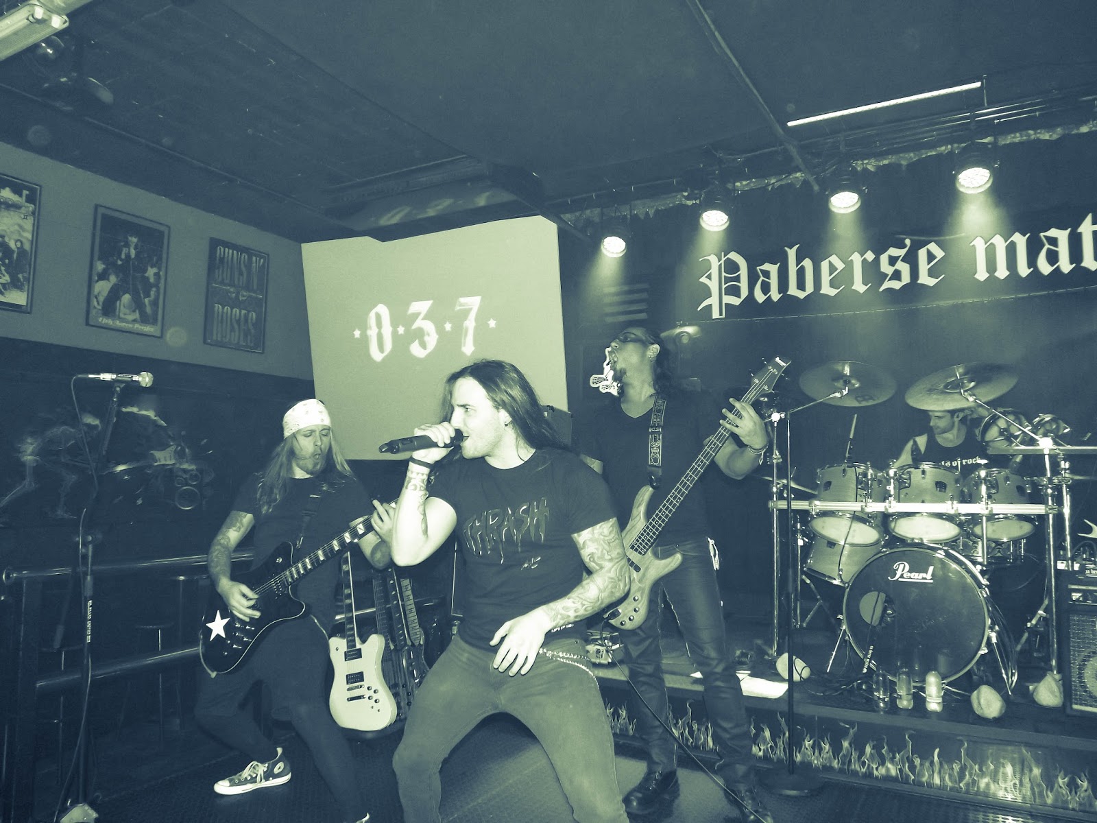 ZERO3IETE arriba de las tablas… Empiezan con «Sangre y plata» donde vemos a Escorpión e Ix Valieri sin cesar de moverse, sin duda la mejor forma de empezar. Ahora ya con más gente en la sala, más a primera línea aunque aún quedan algunos rezagados… Andy invita a los que están atrás a acercarse, da las gracias a los que estamos en la sala, a