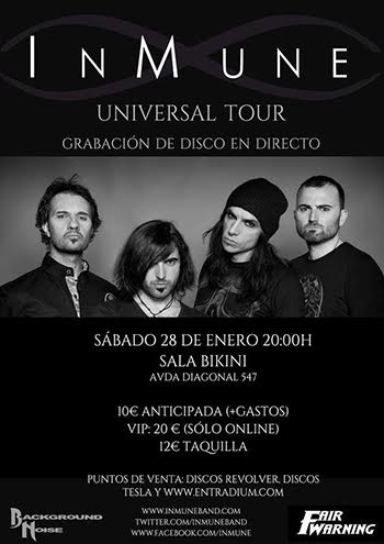 INMUNE están con todos los preparativos de la grabación de su primer CD/DVD en directo. Tras lanzar su tercer disco «Universal» el pasado 30 de septiembre y que presentarán oficialmente en Barcelona el próximo 28 de enero en la Sala Bikini, aprovecharán la ocasión de tocar en esta sala tan especial para grabarlo todo en audio y video para una posterior edición de un show de la banda en directo.