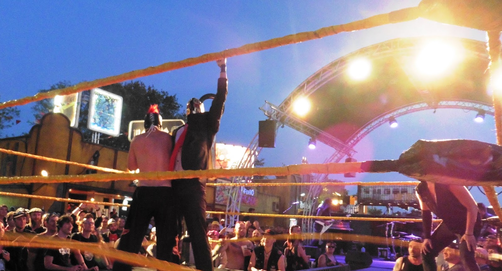No estaba incluido en el show pero hubo un par de espectadores que se emborracharon y se pusieron bastante pesados, llegando incluso a subirse al ring. Al final los luchadores les echaron a leches del ring. Tras un par de horas de show nos retiramos a las tiendas de campaña, lo bueno de verdad empezaba al día siguiente.