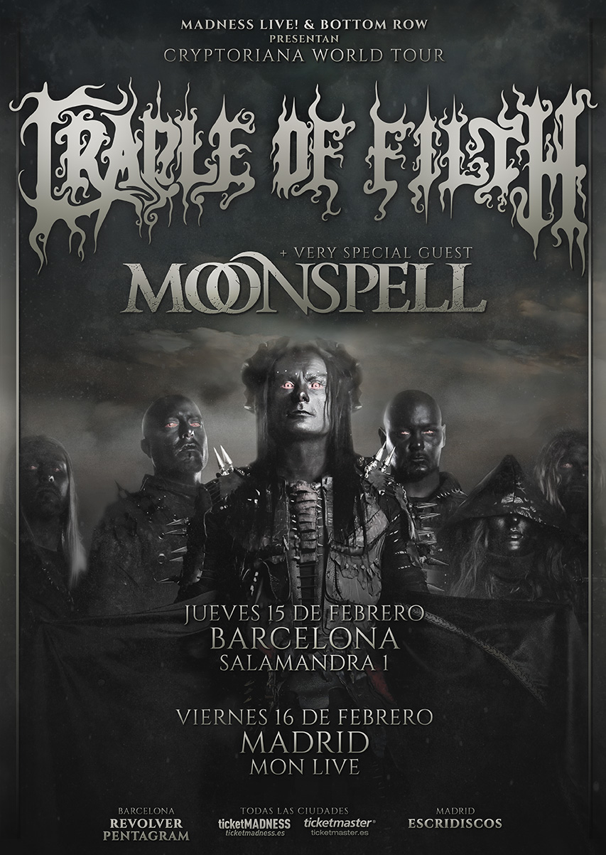 Los británicos CRADLE OF FILTH visitarán Barcelona y Madrid el 15 de Febrero en la Sala Salamandra y el 16 de Febrero en la Sala Mon Live respectivamente, de la mano de Madness Live! y Bottom Row, para presentar su nuevo disco «Cryptoriana – The Seductiveness of Decay» que tal y como ha dicho Dani Filth, el vocalista de la banda, es un antes y un después para los Cradle. Dani lo define así: «El álbum está fuertemente infundido por el horror gótico victoriano y el título es un reflejo de esto. Cryptoriana implica el encaprichamiento victoriano con lo sobrenatural, el sepulcro y lo macabro. El subtítulo ‘The Seductiveness Of Decay’, además, cimenta esta atracción por la muerte y el reluciente y lento proceso de la autoaniquilación».