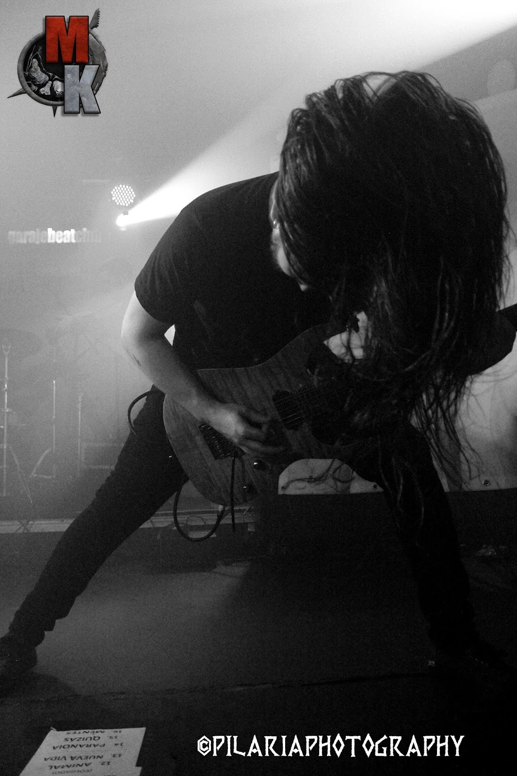 «Gondwana» comenzaba con la percusión de Míriam Baz, un tema que fue aplaudido y recibido por el público con bastante entusiasmo. Un entusiasmo que proseguía con «Ablepsia» que reventaba cabezas y cuellos en la Garaje, algunos voluntarios, otros involuntarios. A servidora le dieron un buen condazo en la cabeza mientras buscaba la foto porque la marea estaba completamente enloquecida. Casi parecía un grupo de infectados de la saga de películas Resident Evil.