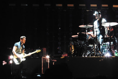 Entre tema y tema Kerr iba cambiando de bajo sin apenas dar tiempo a respirar. El duo apenas se habia comunicado con el público. La primera excepción fue en el tema «Little monster», en el que Mike nos pidió cantar con él. Realmente no hacía falta porque la gente llevaba haciendolo todo el tiempo. A mitad de este tema Ben centró todas las miradas con un solo de batería antes de que retomarán el tema para finalizarlo. Inmediatamente empalmaron con el tema «Hook, line & sinker». En las pausas entre temas pude fijarme en la camiseta de Ben Thatcher que, aunque a simple vista parecia del grupo Misfits por la imagen y el tipo de letra, en realidad ponía BEYONCE encima de la icónica imagen de los Misfits.