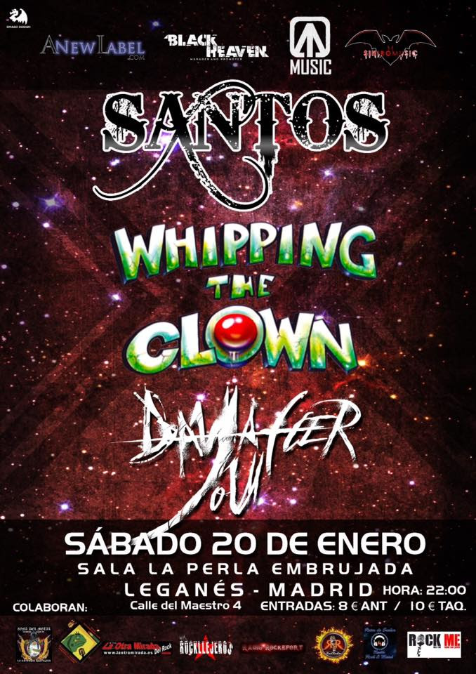 Los catalanes WHIPPING THE CLOWN no conocen fronteras y es que, en poco menos de dos semanas van a estar haciendo temblar los cimientos de La Perla Embrujada de Madrid con los temazos de su último trabajo,»Playground«. En esta ocasión, el cartel de la velada del próximo sábado 20 de enero se completará gracias a otros dos grandes grupos del género como son SANTOS y DAY AFTER YOU. Las entradas anticipadas para asistir al evento ya están disponibles.