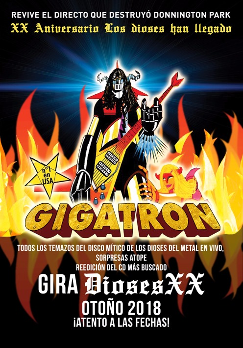 La banda valenciana GIGATRON, que practican el rock humorístico como ellos dicen o lo que es lo mismo, caricaturizan el heavy de los 80-90 tanto con sus indumentarias como con sus actitudes y su estilo, anuncian que, por el 20 aniversario de su primer disco, Los Dioses han llegado, realizarán una gira en otoño (GIRA DIOSES XX) con muchas sorpresas, así que estaremos pendientes para confirmaros fechas.
