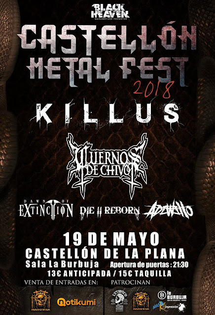 Entre ellos KILLUS, presentando su nuevo disco Imperator, el reconocido metal extremo de calidad de CUERNOS DE CHIVO, ADEWELLO, dispuestos a cortar cabezas antes de salir, DAWN OF EXTINCTION y DIE II REBORN,