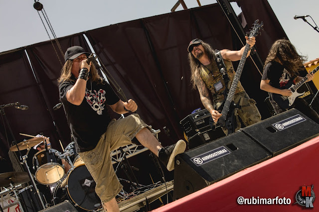 TENIA fueron los únicos de casa (y de la propia Maracena). Llevando 20 años ya de trayectoria practicando un death metal muy pesado y con ciertos tintes melódicos, estos veteranos tuvieron la difícil tarea de arrancar el festival en pleno sol y con un público que aún estaba incorporándose. Pese a ser los primeros era imposible que pasaran desapercibidos con su potente death metal. De hecho, creo que no me precipito al decir que fue el grupo que ofreció el sonido más bestia al festival.