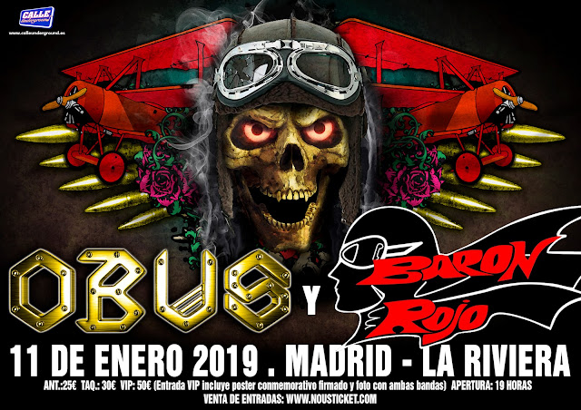 OBUS sigue imparable y esta vez lo hará de la mano de otra leyenda del heavy/rock español, BARÓN ROJO. Las dos bandas unirán fuerzas para ofrecer un concierto único con el que todos los fans del género llevan soñando durante años. La mítica sala La Riviera, de Madrid, será testigo de esta cita inolvidable que tendrá lugar el próximo 11 de enero de 2019. Las entradas están ya a la venta a través de www.nousticket.com.