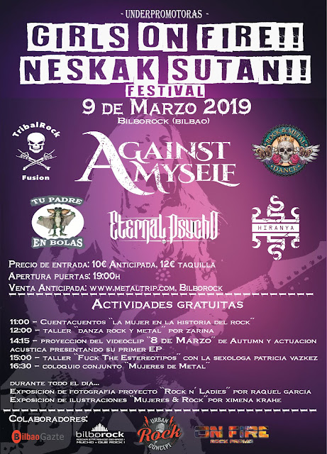 El próximo sábado 9 de marzo se reunirá en Bilbao una muestra de lo más potente y cañero del rock. metal y punk femenino. Cuatro bandas de distintos puntos del estado y, además, un sorprendente espectáculo de metal dance, un concierto acústico, proyecciones, talleres, stands, exposiciones, charlas… La sala Bilborock acogerá, en plena resaca del 8M, un festival a medio camino entre la reivindicación y la fiesta, un evento arrollador que promete acudir al personal y dar mucho que hablar.
