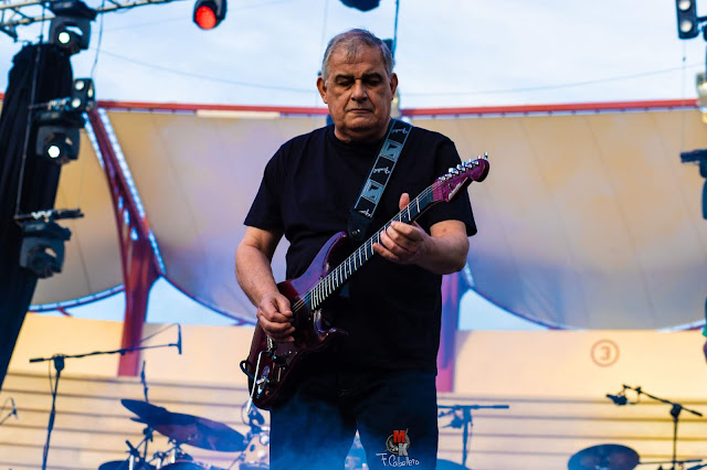 Corrimos hacia un foso amplio y nos pusimos a hacer las primeras fotografías de la noche, aún con mucha luz diurna que hizo deslucir ligeramente el show de Javier Ojeda y los suyos. El estado de forma de Ojeda es apabullante. Con casi 55 años a la espalda dio una lección de profesionalidad, buen hacer, técnica vocal y energía vibrante. La banda es espectacular especialmente Chris Navas al bajo y Manolo Rubio a la guitarra, dos de los miembros con más personalidad y carisma. DANZA INVISIBLE es toda una institución de la new wave española, símbolo de la movida madrileña. La nostalgia era palpable y con un derroche de energía, Javier y los suyos hicieron acopio de su veteranía, entregándonos himnos como Sabor de amor, Catalina, Agua sin sueño, Sin aliento, El ángel caido y otros tantos… una auténtica maravilla que me llevó a mi infancia, donde mis hermanos disfrutaban de la música de moda y yo me empapé de ella.