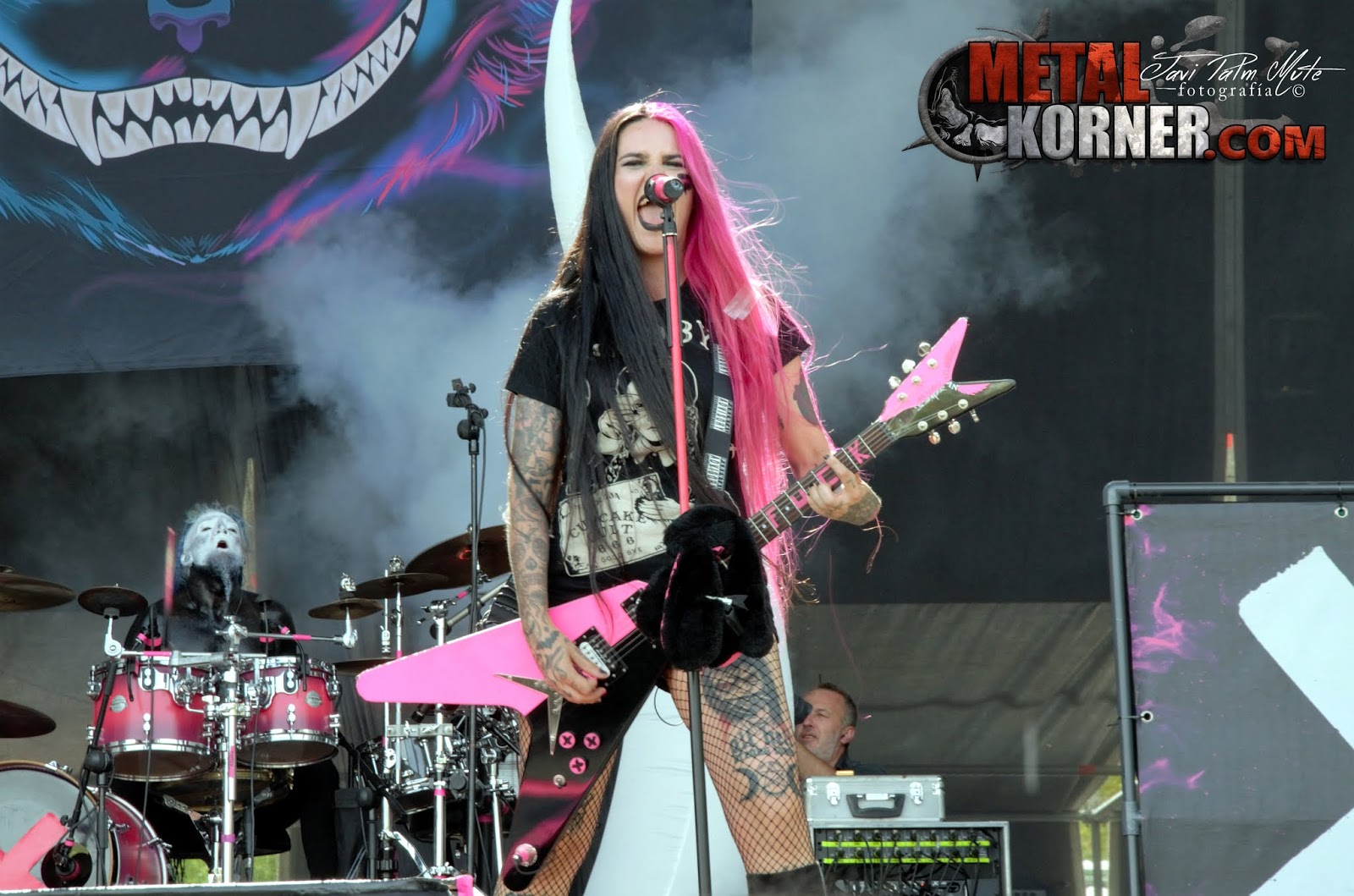 Sin tiempo para saludar empieza MEGARA. Y estoy gratamente sorprendido, me gusta su música, aunque usan y abusan de samplers. La puesta en escena es espectacular con bailarines y actores. Entre coreografía, riffs y composiciones bien elaboradas, el público se queda muy contento con la actuación. Sobresale la figura de Kenzy sobre los demás miembros, no porque los demás dieran poco show, es que ella es puro espectáculo. Aún quedaba por llegar el tema final, una reproducción de “Alicia en el país de las maravillas”, con una puesta en escena espectacular. El momento épico fue una vez terminado, Pol DQ (batería) no se pudo resistir a cabalgar a lomos de un unicornio hinchable que traía un asistente. Lo llevaron en stage diving sobre un mar de manos, en un equilibrio incierto hasta que se acabó cayendo de espaldas, sin pasar a mayor el incidente, ni daños personales.