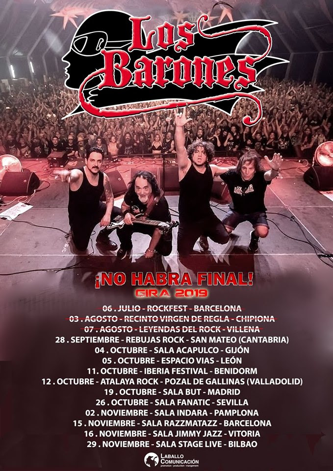 Después de su paso por los principales festivales del país con críticas inmejorables de prensa y público, LOS BARONES ya preparan su inminente gira #NoHabraFinal, que promete ser la constatación definitiva de que Sherpa y Hermes Calabria están de vuelta y en plena forma. Junto a Sergio Rivas y Marcelo Calabria a las guitarras, la banda hará un extenso repaso por la discografía que les dió fama, rescatando canciones menos habituales en un show de 120 minutos de duración. Alguna canción nueva como la recién estrenada como Vive hoy y montón de sorpresas más, completan un espectáculo que ningún amante del rock duro puede perderse.
