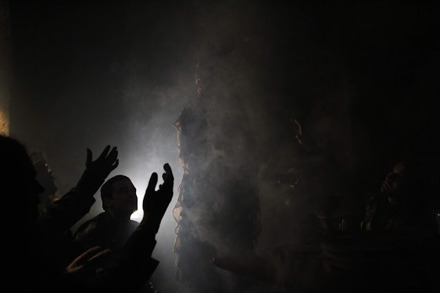 MILETH: Este grupo de mujeres recrean un ritual llamado O abellón. Según hemos sacado de algunos textos, éste era un velatorio que consistía en que las personas allí presentes debían ayudar al alma del difunto a abandonar el cuerpo. Se disponían en círculo y cogidos de la mano emitían un canto que recordaba al de un abejorro. Este ritual ha podido persistir en ciertas zonas del rural gallego como mínimo hasta principios del s. XX y hemos querido recrear, o tan siquiera acercarnos, a esa época a través de la vestimenta.