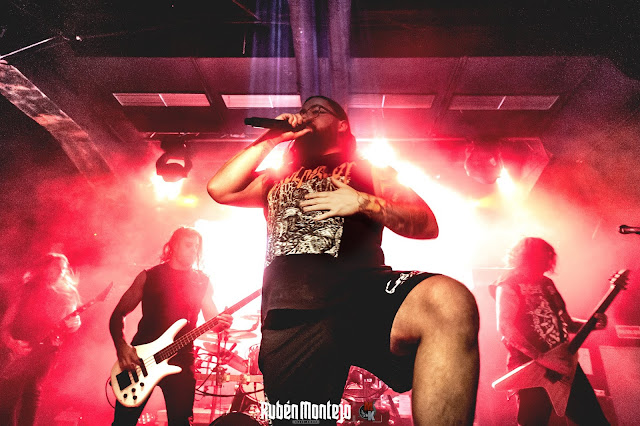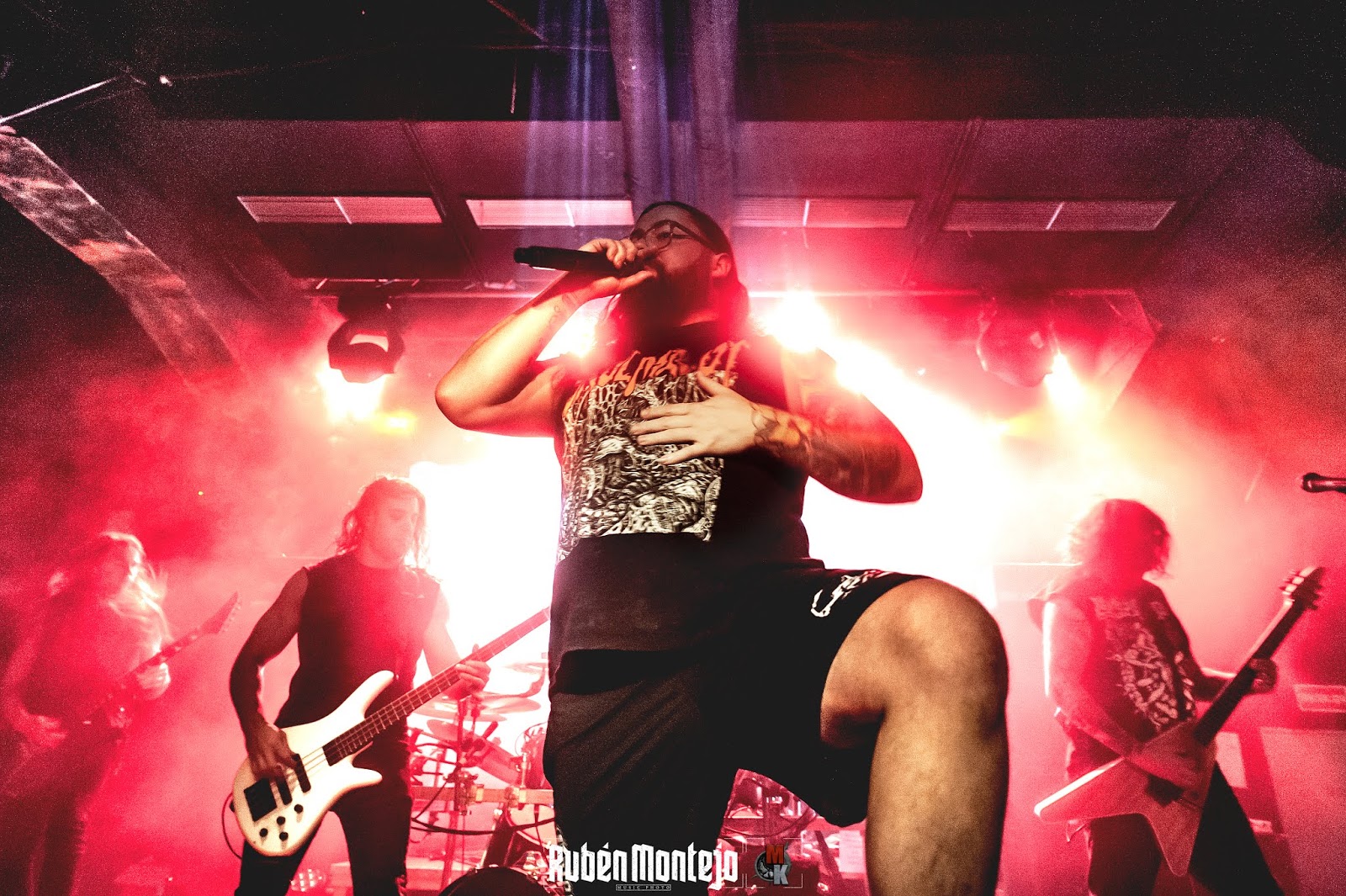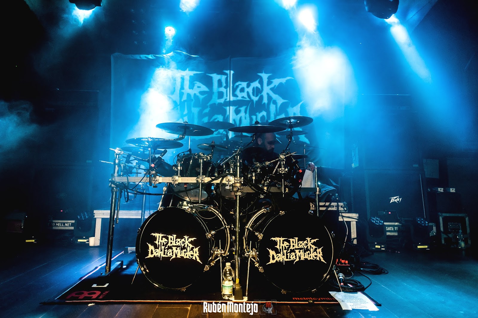 Tras un cambio de unos 15 minutos, llegó la hecatombe con THE BLACK DAHLIA MURDER. Un grupo bastante desconocido para mí, así que he tenido que hacer un poco de investigación previa. Los de Michigan (Detroit, Estados Unidos) hicieron una demostración del death metal melódico más visceral y extremo que existe hoy día. Al frente de la formación tenemos al mastodóntico Trevor Scott Strnad, todo un frontman, que derrochó potencia y una voz brutal durante todo el show. Con unas gafas estilo vintage, llamó poderosamente mi atención su puesta en escena, dinámica como pocas y deambulando por el escenario sin parar, casi siempre con un brazo en alto, señalando al público o directamente, al techo. Aunque el show comenzó con un sonido un tanto embarullado, poco a poco fue mejorando hasta disfrutar del mejor sonido de la noche, especialmente el baterista Alan Cassidy que fue todo un vendaval, regalándonos una técnica precisa, brutal y con enormes detalles de calidad, amén de unos blast-beats de otro planeta. Su bajista Max fue otro de los músicos protagonistas del show y es que debe de tener un cuello de acero, ya que no paró de hacer «el molinillo» en ningún momento con su precioso instrumento níveo.