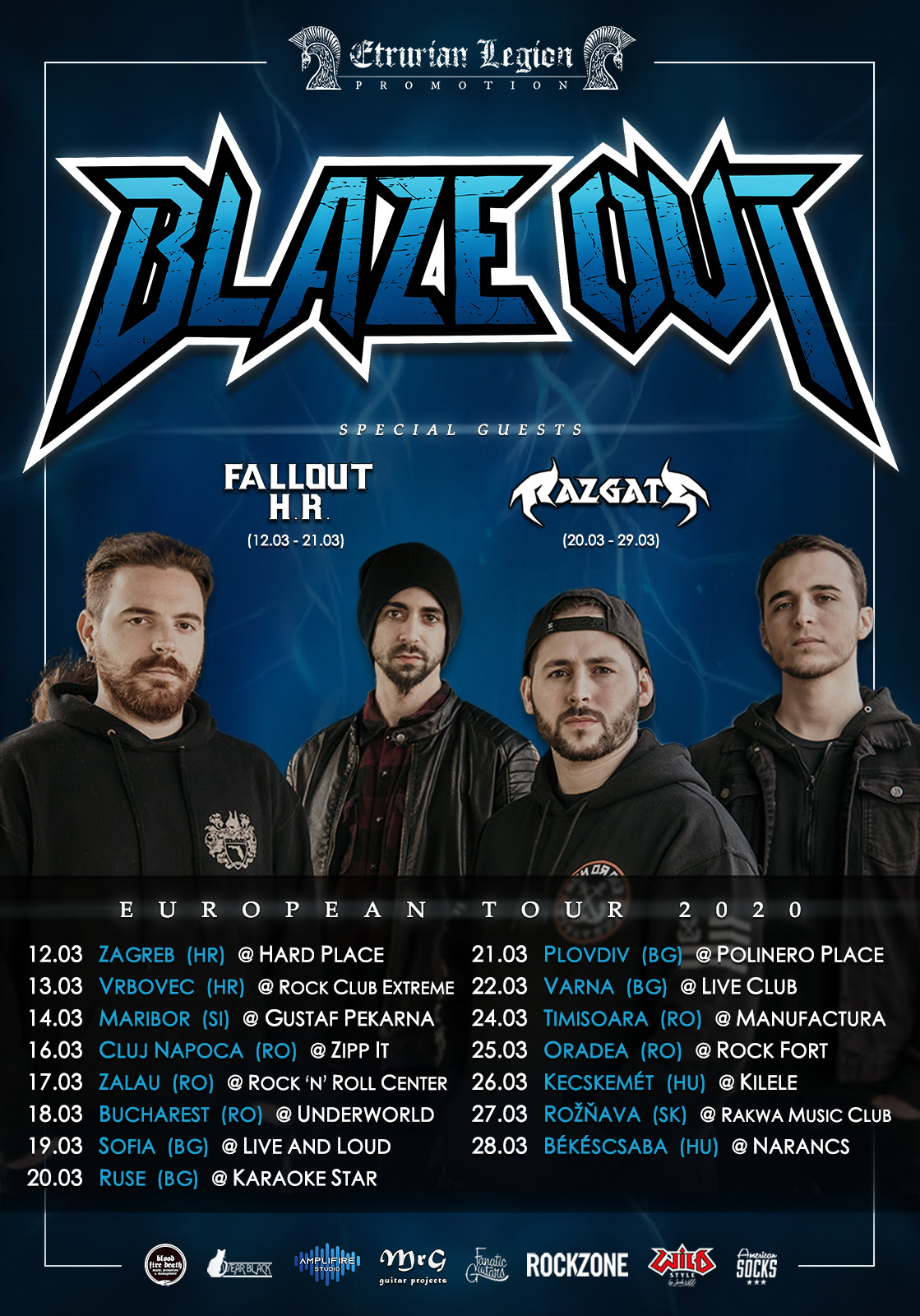 El próximo mes de marzo, BLAZE OUT realizará su mayor aventura hasta la fecha. Del día 12 hasta el 28 darán un total de 15 conciertos en 6 países distintos, en los que les acompañarán en dos tramos diferenciados las bandas italianas Fallout H.R. y Razgate. Croacia, Eslovenia, Rumanía, Bulgaria, Hungría, Eslovaquia… ¿¡Estáis preparados para Instinct!? Esto no habría sido posible sin la alianza de Blood Fire Death con Etrurian Legion Promotion. ¡Por fin empieza la conquista europea de BLAZE OUT! Estas son las fechas de la gira: