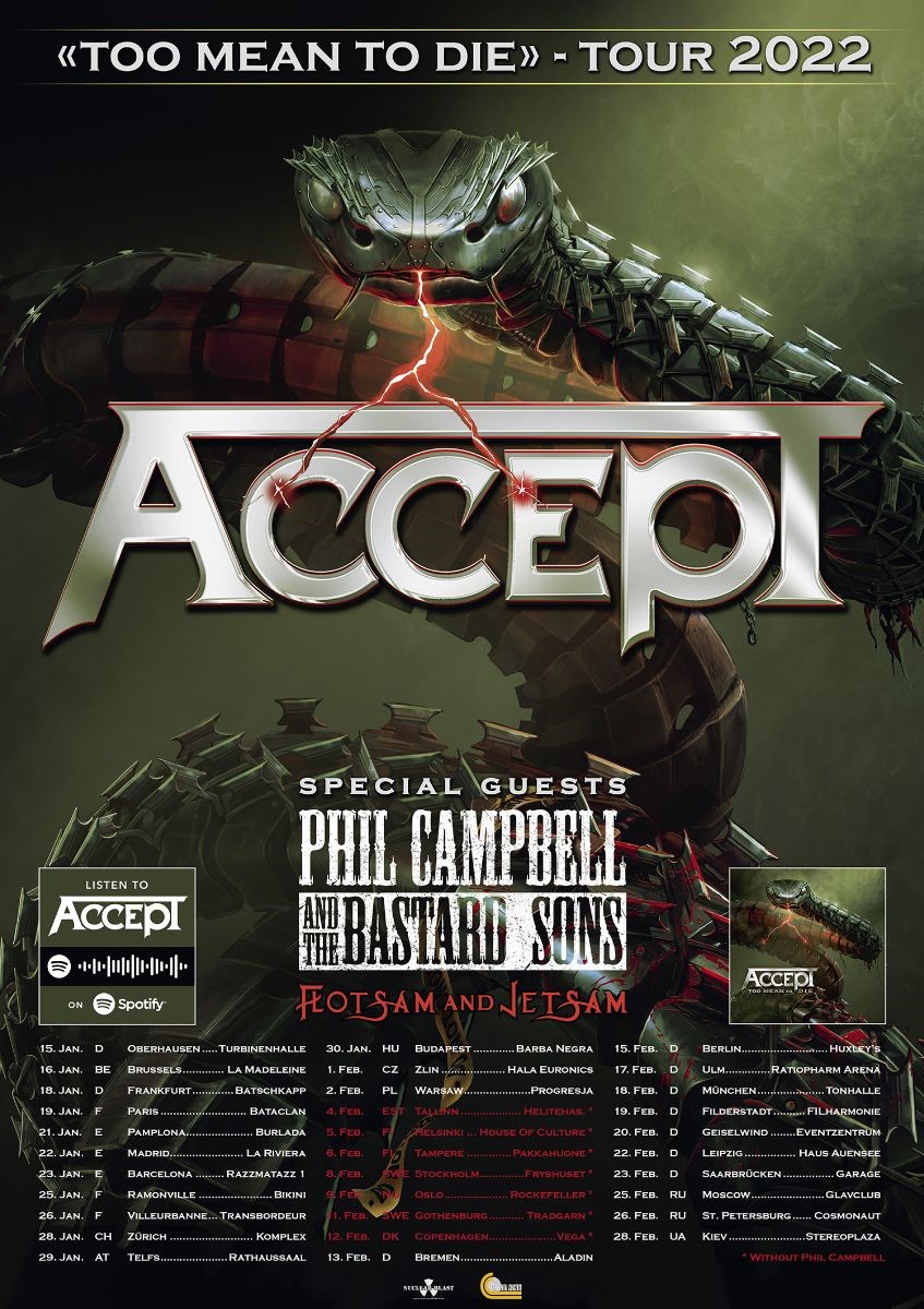 El nuevo álbum de ACCEPT With Too Mean To Die se lanzó oficialmente hace dos meses. Ahora la banda germana ha anunciado una gira por Europa para promocionar su nuevo disco. Se celebrará durante los meses de enero y febrero de 2022, con un total de 32 fechas. Los teloneros serán PHIL CAMPBELL AND THE BASTARD SONS y los thrashers FLOTSAM AND JETSAM. Las paradas en España sucederán los días 21, 22 y 23 de enero de 2022 en Pamplona, Madrid y Barcelona respectivamente.