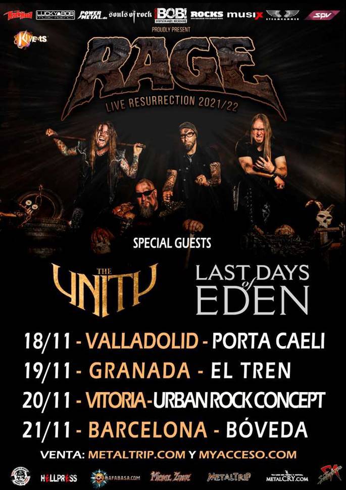 Las entradas para ver a RAGE durante el «Live Resurrection Tour 2021» están a la venta en Metaltrip y Myacceso, además de los puntos habituales en cada una de las ciudades. Las fechas confirmadas en nuestro país son las siguientes: