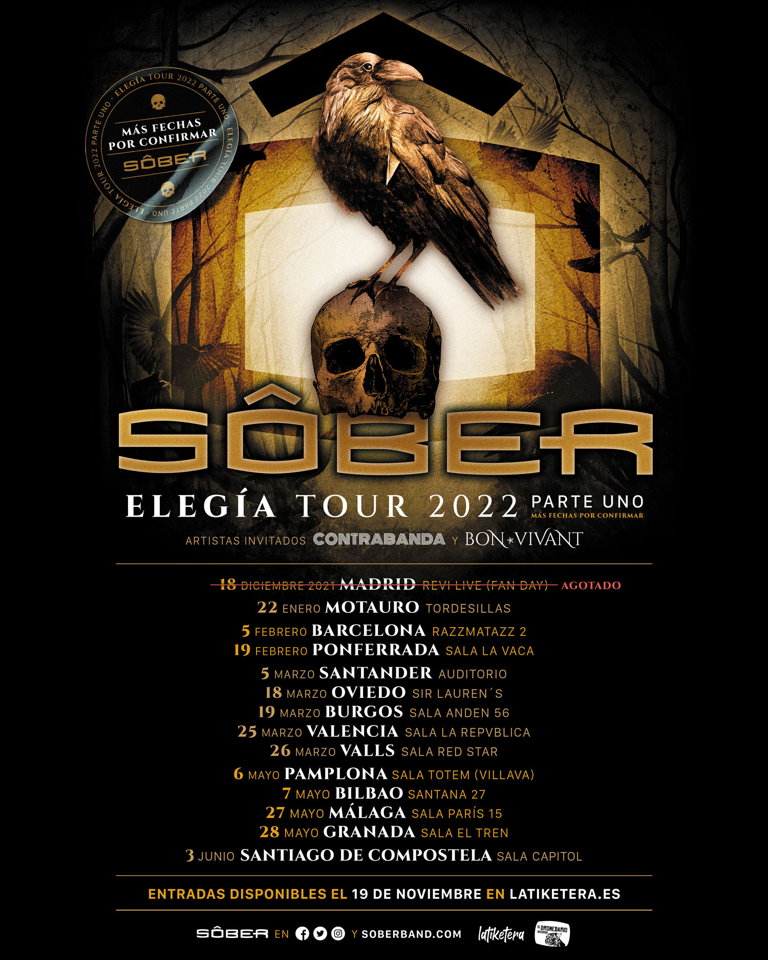 En El día de la liberación, dirigidos por Javier Bragado, SÔBER se «mojan» lanzando un mensaje muy claro: «STOP BULLYING». Lo hacen sobre un clip vibrante y llamativo en el que asumen todo el protagonismo para que el mensaje de apoyo, fuerza y optimismo no se desvirtúe. El estreno del videoclip llega junto a otro anuncio importante y que se esperaba desde hace mucho tiempo: la gira de presentación de Elegía. Las entradas estarán disponibles a partir del 19 de noviembre en Latiketera.es. En todas las ciudades les acompañarán CONTRABANDA y BON VIVANT, ambas presentando sus respectivos nuevos trabajos. Las primeras fechas confirmadas del ELEGIA TOUR 2022 son las siguientes: